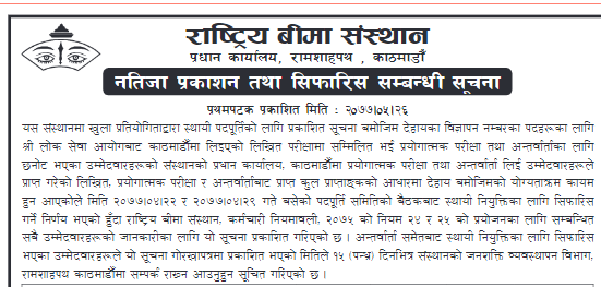 Read MoreRastriya Beema Sansthan, Ram Shah Path, Kathmandu has published the final result of assistant level 4. The examination was conducted by