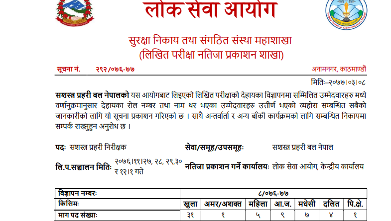 Results of written examination for the post of Assistant Inspector of Armed Police published APF Result PDF Check here Loksewa