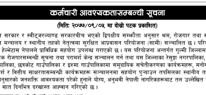 Read MoreDetails VACANCY ANNOUNCEMENT At Safer Migration Project (SaMi) (Date: 2077/09/05 Published for the second time) According