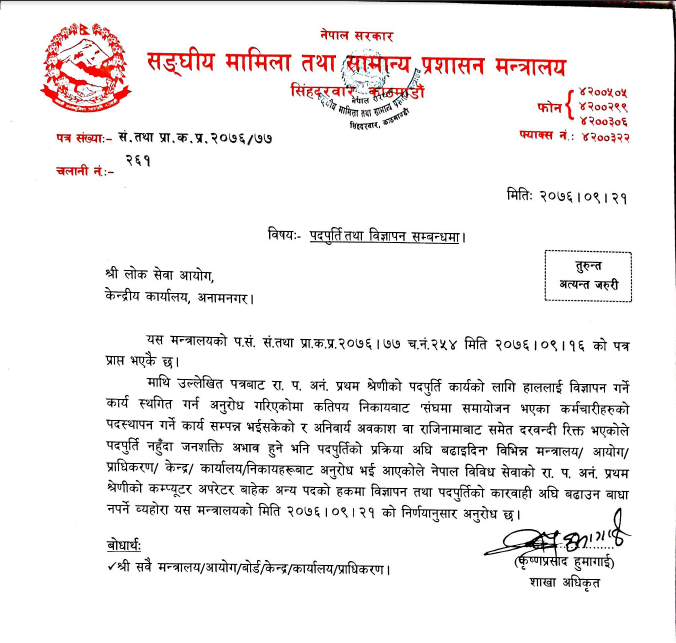 The Ministry of General Administration is issuing a notice again today giving way to the Public Service Commission to advertise in posts other than computer operator.